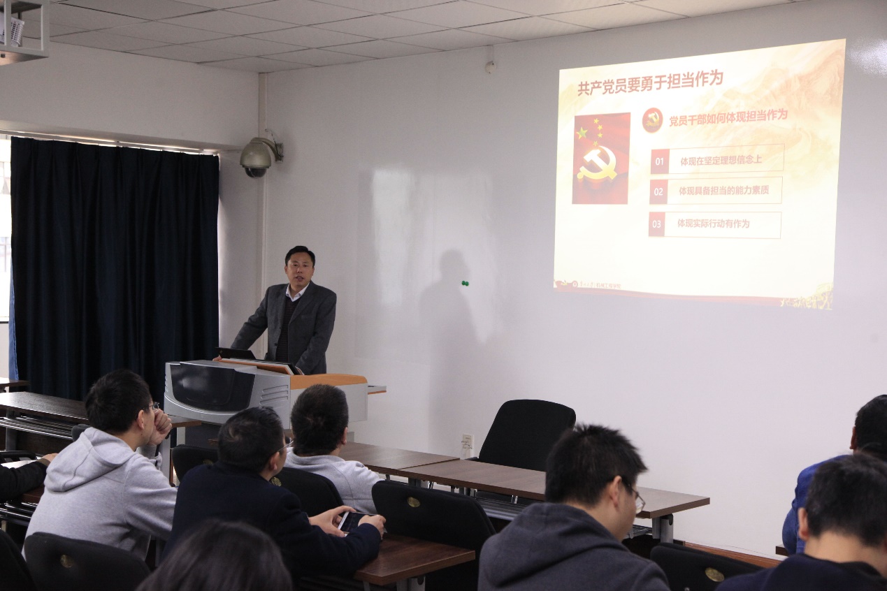 李少波院長通過對擔當作為內涵的解讀,結合習近平總書記的重要論述,全面具體闡釋了擔當是一種責任、一種工作作風、一種思想境界。能力有大有小,職務有高有低,但責任心不能可有可無。黨員干部在其位司其職,就要對黨負責、對人民負責、對自己負責。無畏的擔當精神是習近平新時代中國特色社會主義思想的理論品格。他強調,敢于擔當,是黨員干部高尚的政治品格,擔當起該擔當的責任,是當代黨員干部的工作作風和良好的精神狀態。中國特色社會主義進入了新的發展階段。在新時代,廣大黨員干部要不忘初心,牢記使命,奮勇向前,以永不懈意的精神狀態和一往無前的奮斗姿態,以新作為新擔當諶寫新的時代簡章。新時代要有新擔當,思想是行動的先導,是激發黨員干部擔當作為的動力源泉。堅持 “一個武裝”、強化“三個擔當”、做到“三個帶頭”的要求。