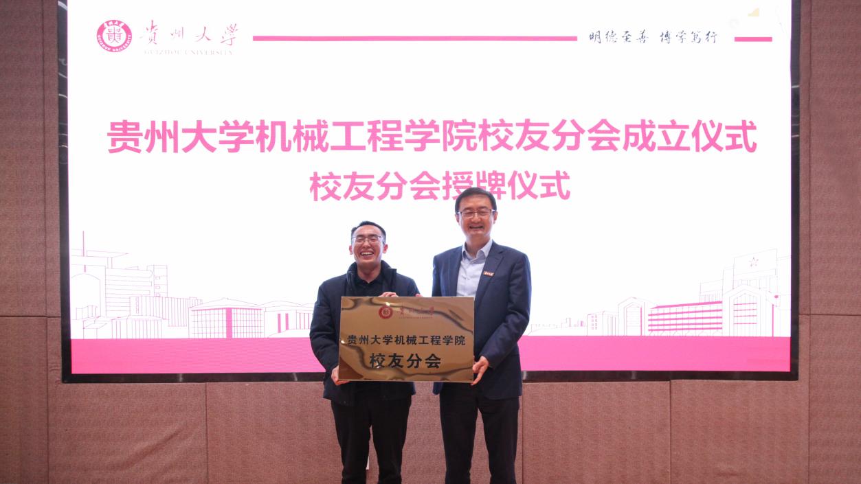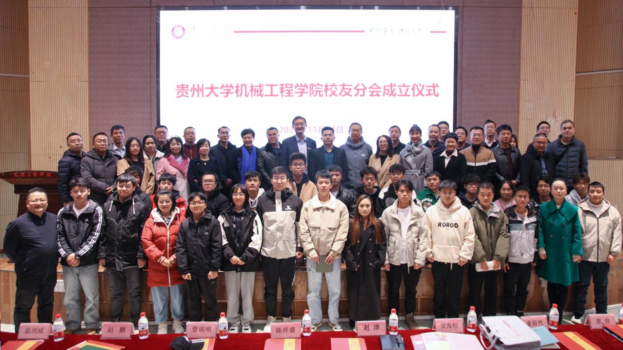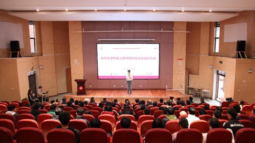 1114日下午,貴州大學機械工程學院校友分會成立儀式在貴州大學機械工程學院圓形報告廳隆重舉行。貴州大學副校長陳祥盛、校友總會副秘書長趙鵬、原貴州大學機械工程學院黨委書記管琪明,機械工程學院黨委書記滕召華、院長趙津、正處級組織員董蔚然、黨委副書記廖燁、副院長李家春、教育部重點實驗室常務副主任黃海松以及機械工程學院校友分會理事代表聯想集團西南大區貴陽地區總經理溫劍威、日立能源 (中國) 有限公司貴陽分公司經理曾禮、貴州尚璽建設工程有限公司總經理陳婭玲、山東江山無憂文化有限公司董事長吳興瓊、貴州永麗機械技術有限公司總經理姚必根以及部分教師和校友代表共同出席了此次成立儀式機械工程學院學生代表林磊主持了會議。