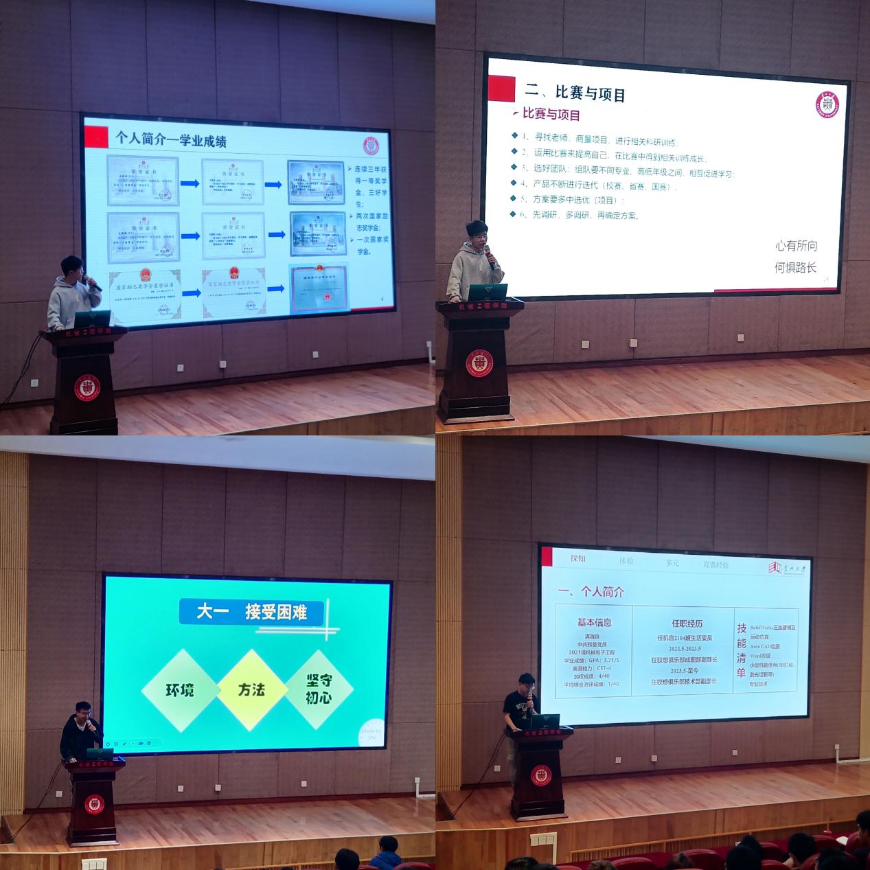 分享會(huì)上,4名國(guó)家獎(jiǎng)學(xué)金獲得者周鑫、王路凱、楊懷誠(chéng)、滿珈良從個(gè)人發(fā)展規(guī)劃、學(xué)習(xí)經(jīng)歷、科研競(jìng)賽、社會(huì)實(shí)踐等方面分享經(jīng)驗(yàn)。周鑫同學(xué)重點(diǎn)分享了保研、科研競(jìng)賽“干貨”,建議同學(xué)們做好學(xué)業(yè)規(guī)劃,積極參加各項(xiàng)科研競(jìng)賽,扎實(shí)專業(yè)知識(shí)。王路凱同學(xué)就如何提升專業(yè)能力、如何平衡學(xué)習(xí)和生活,分享專業(yè)必備軟件與技能、參賽經(jīng)驗(yàn)、成果轉(zhuǎn)化、情緒調(diào)節(jié)等tips。楊懷誠(chéng)同學(xué)結(jié)合自身規(guī)劃發(fā)展,建議同學(xué)們從大一開(kāi)始盡快適應(yīng)環(huán)境,打好基礎(chǔ),大二專注提升理論和實(shí)踐,爭(zhēng)取大三鉆研出成果。2名國(guó)家勵(lì)志獎(jiǎng)學(xué)金獲得者楊小彬、金別樹(shù)解讀國(guó)家勵(lì)志獎(jiǎng)學(xué)金評(píng)選條件,鼓勵(lì)同學(xué)們合理規(guī)劃學(xué)習(xí)時(shí)間,利用互聯(lián)網(wǎng)、圖書(shū)館等學(xué)習(xí)資源擴(kuò)大知識(shí)面和深化理解,保持良好身心健康。