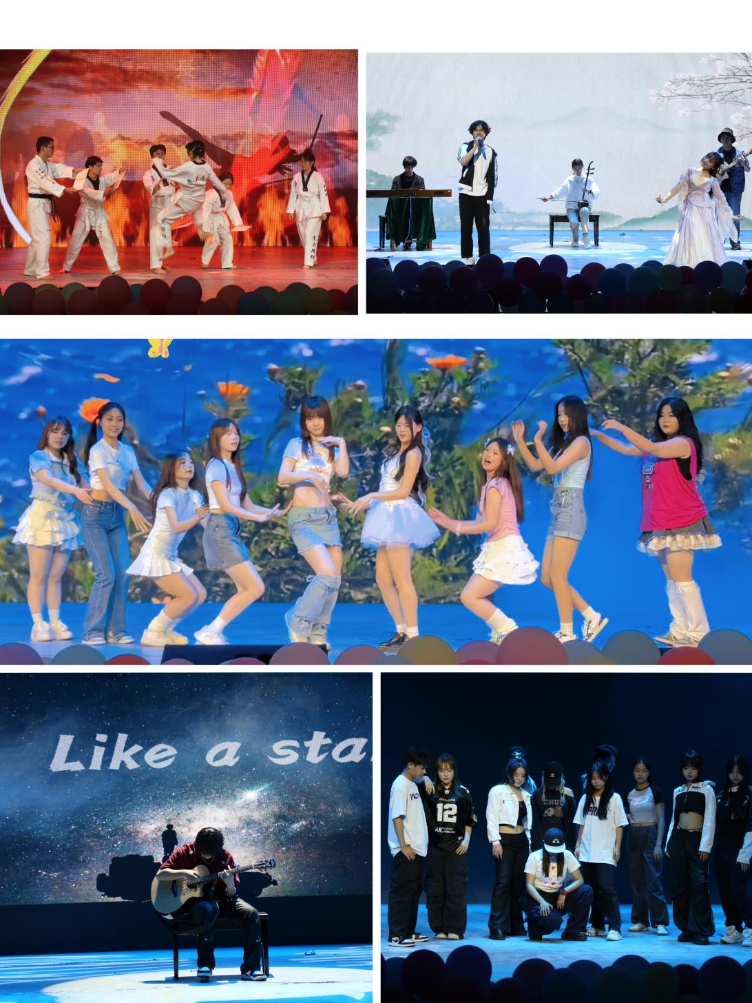 互動環節結束后,來到第二篇章《成長》,由各學生社團帶來精彩表演,舞蹈《STAY THIS WAY》激情澎湃,跆拳道表演《炫動青春》身姿矯健有力,樂器合奏《蘭亭序》悠揚婉轉,舞蹈《RISING》盡顯風采,吉他指彈《LIKE A STAR》憑借高超的技術獲得全場喝彩。