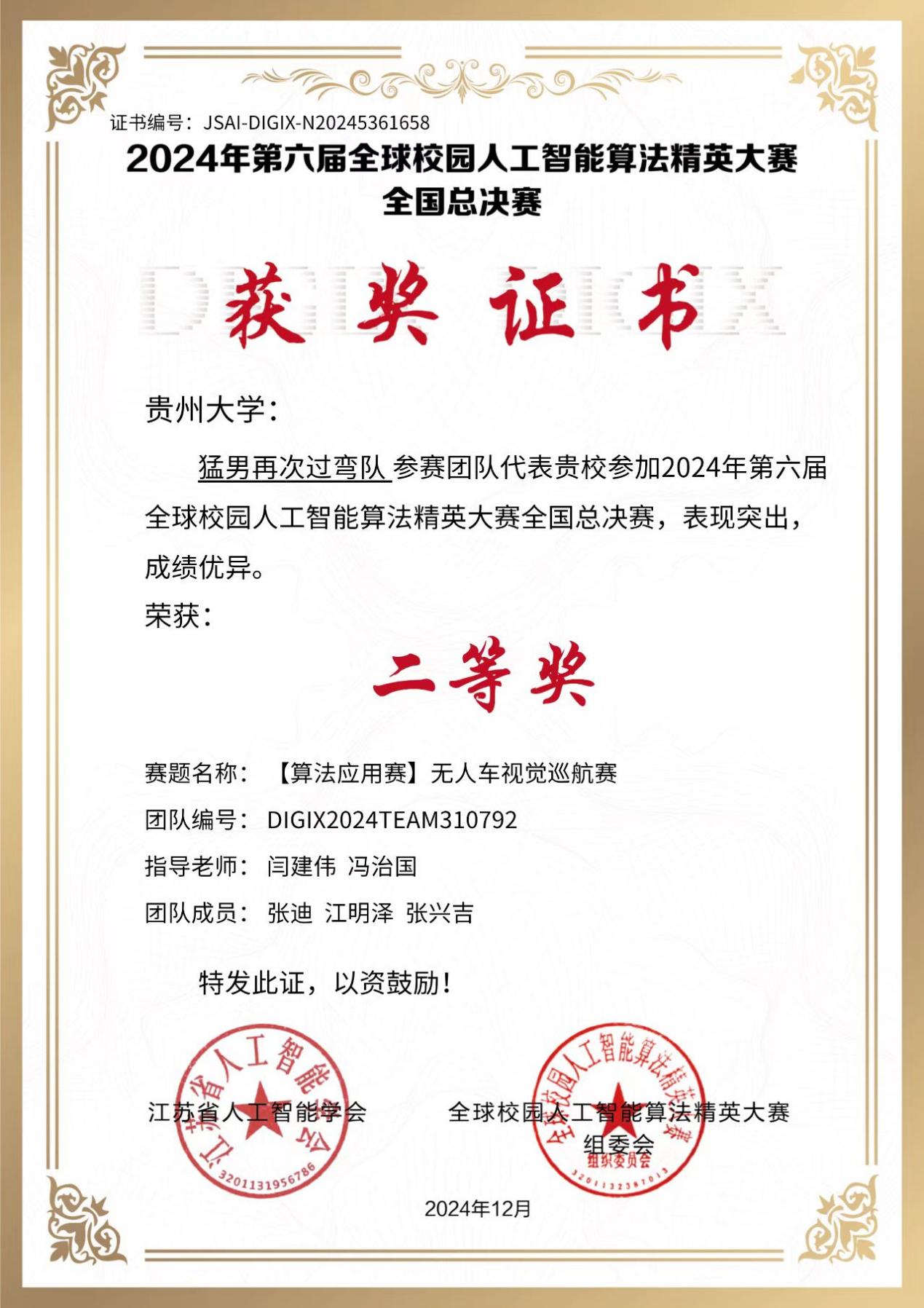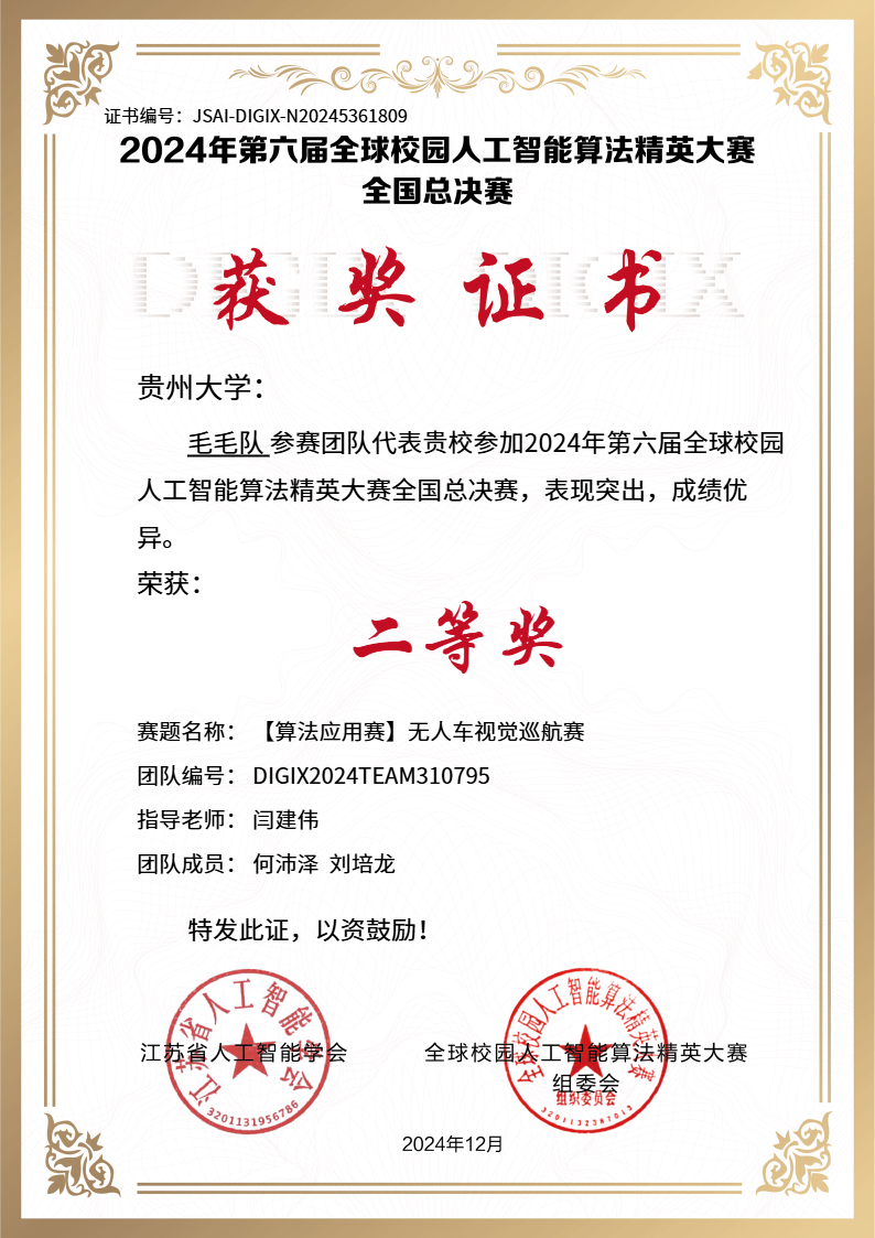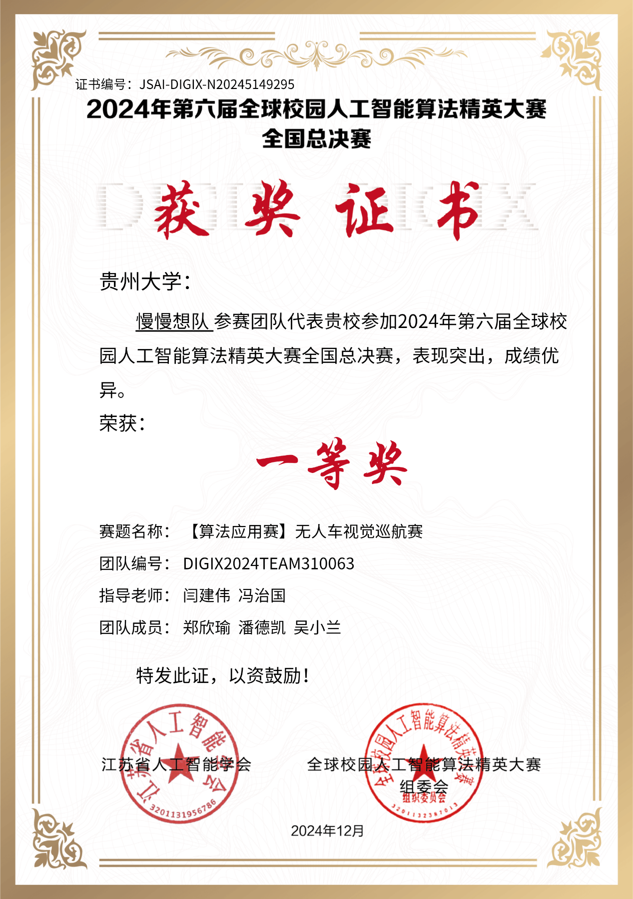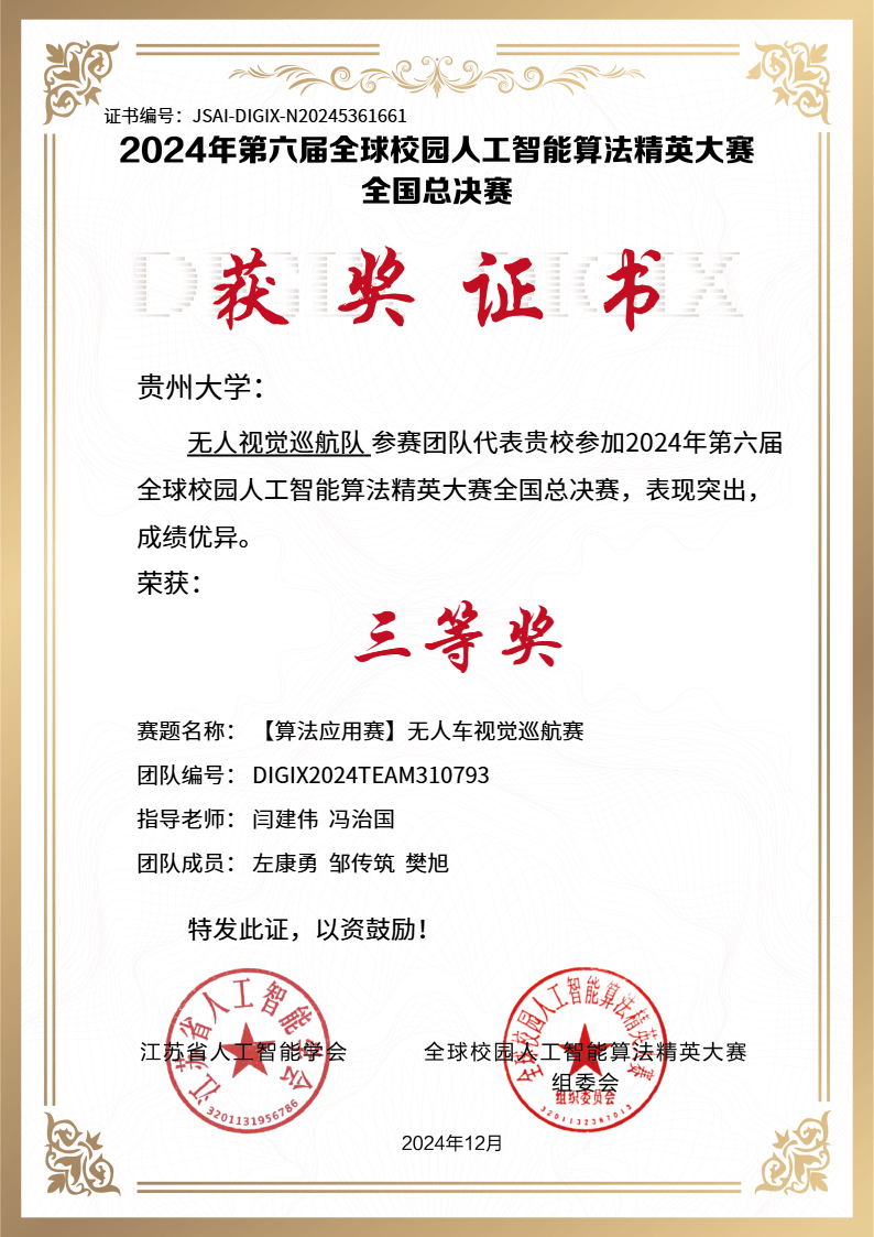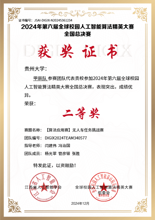 此次全國總決賽貴州大學派出由機械工程學院閆建偉、馮治國等老師指導的9支隊伍參加算法應用賽無人車任務挑戰賽、算法應用賽無人車視覺巡航賽、算法創新賽人工智能+新農科等賽項,經過激烈角逐,共斬獲了2項國賽一等獎、3項國賽二等獎、1項國賽三等獎,這是繼參加第二十六屆中國機器人及人工智能大賽后再次獲得國賽一等獎2項,再次創造了貴州大學參加該比賽的歷史最好成績。