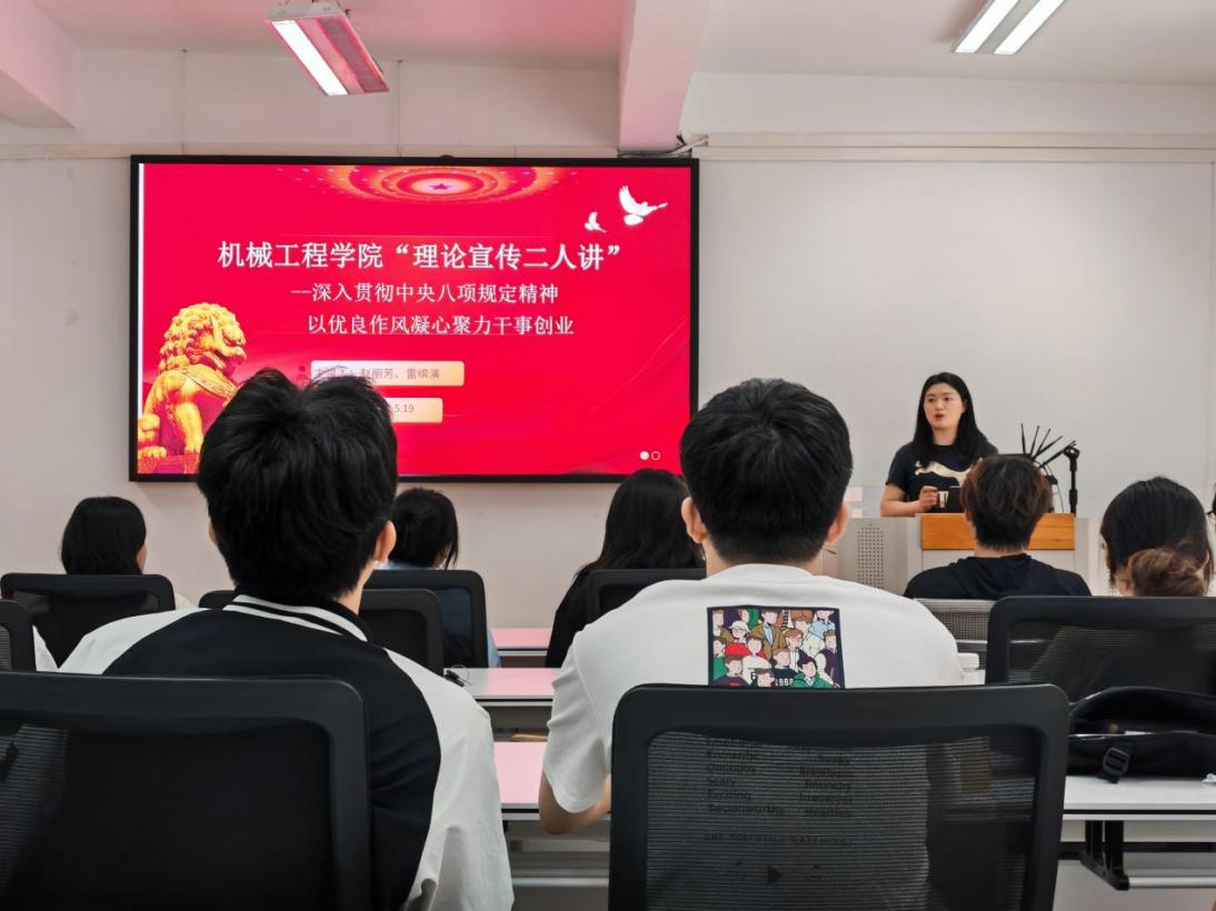 為深入貫徹中央八項(xiàng)規(guī)定精神學(xué)習(xí)教育,以優(yōu)良作風(fēng)凝心聚力、干事創(chuàng)業(yè)。5月 19日,機(jī)械工程學(xué)院本科生第三黨支部以中央八項(xiàng)規(guī)定為學(xué)習(xí)主題,開展“理論宣傳二人講”活動(dòng)。