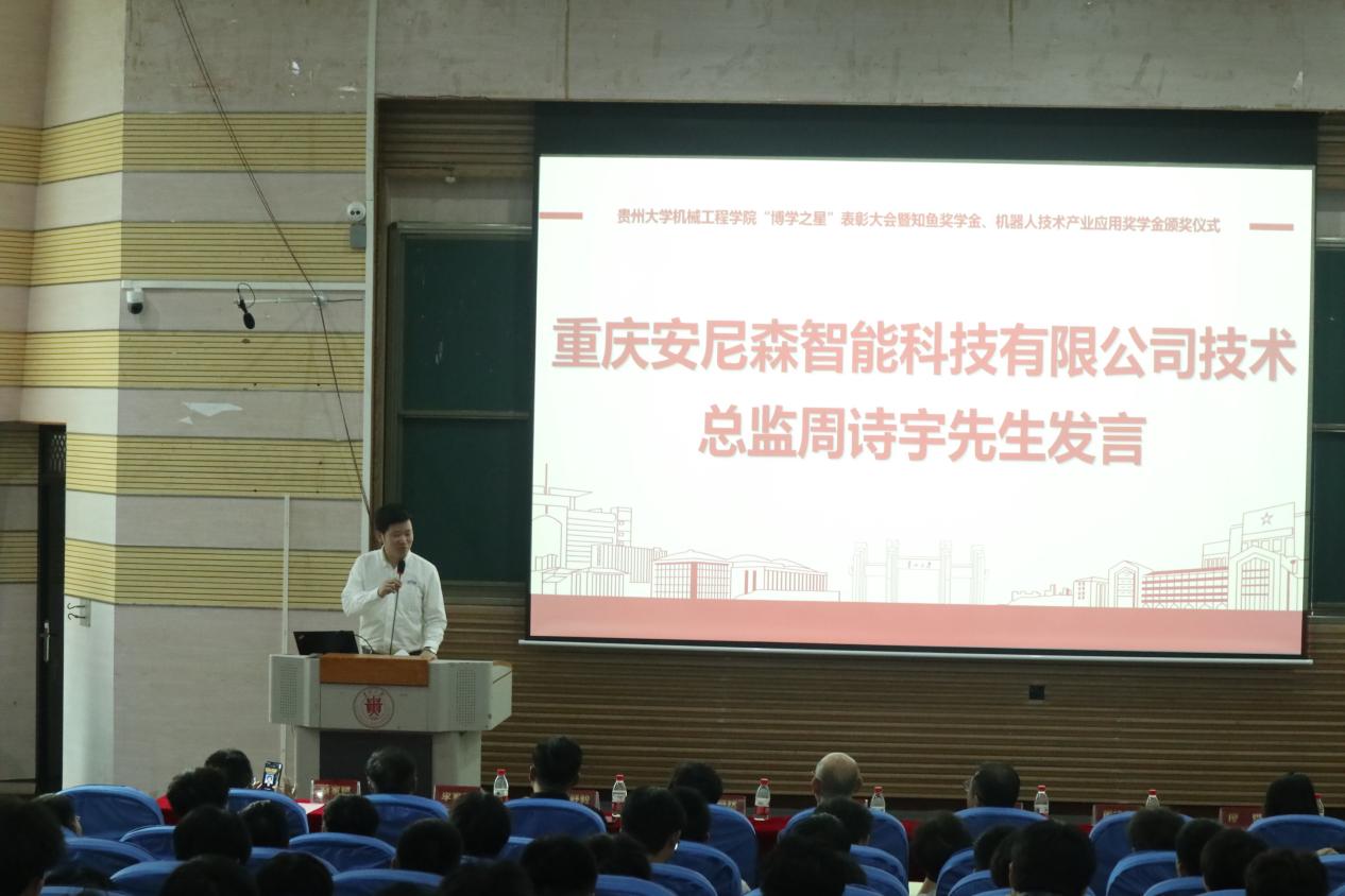 韓陽先生介紹企業艱難的發展過程,遇到的難題及解決辦法,鼓勵同學們要堅持克服困難努力拼搏。同時也強調人才對于制造業升級的關鍵作用,希望機械學子爭做復合型人才,并對獲獎學子寄予厚望,期待未來有更多機械學子加入產業報國行列。重慶安尼森智能科技有限公司技術總監周詩宇講述他的成長經歷,分享科技創新心得,鼓勵同學們夯實基礎、勇于探索,積極投身智能制造領域,為產業發展賦能新質生產力。