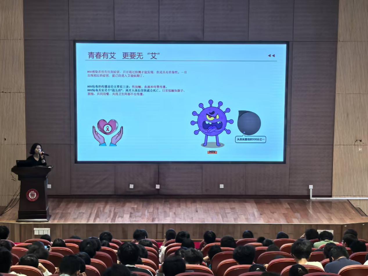 大會第二階段,學(xué)生科輔導(dǎo)員楊朵老師開展防艾宣傳,從艾滋病的傳播途徑、預(yù)防措施、等方面進行講解,著重強調(diào)樹立健康觀念、提高自我保護意識的重要性,引導(dǎo)新生們科學(xué)認識艾滋病,養(yǎng)成良好的生活習(xí)慣,遠離高危行為。同時,輔導(dǎo)員楊朵老師還向新生們介紹校醫(yī)院公眾號的重要欄目及使用方法,方便新生日后隨時獲取醫(yī)療健康服務(wù)保障。