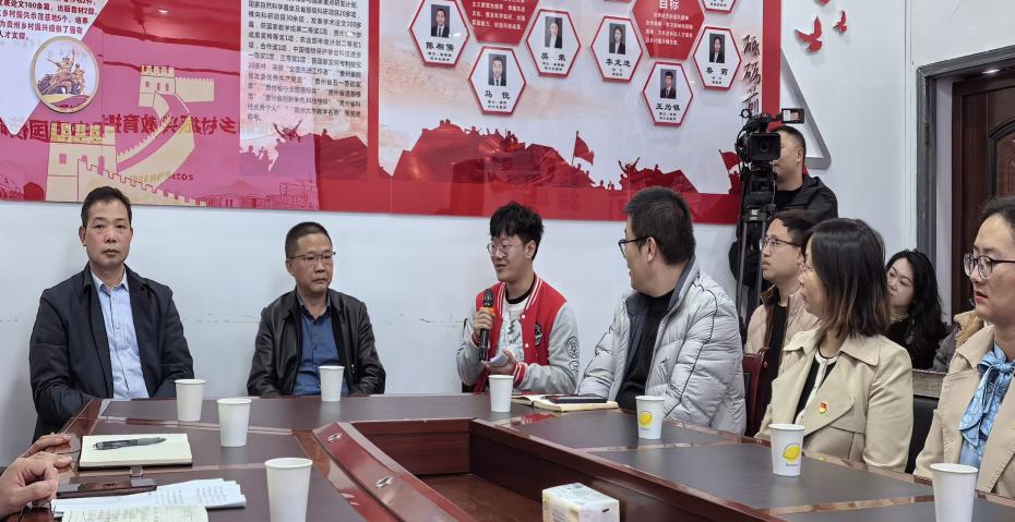 在“聽·一線故事”環節,全體人員移步至農場會議室。大家首先觀看了“全國模范教師”、機械工程學院張富貴教授的紀錄片《田間富貴》,并聆聽了張老師結合親身經歷,講述如何將教育力量轉化為鄉村振興動能的感人故事;隨后,全國先進工作者、貴州大學教學實驗農場副場長龍友華教授分享了自己如何通過科普活動和科技培訓,幫助村民了解新技術、掌握新技能,讓科技真正成為推動鄉村進步的強大引擎。隨后的“1+3”圓桌對談中,學生黨員聚焦“傳承與成長”、駐村隊員聚焦“實踐與賦能”、管理崗教師聚焦“協同與保障”,與張老師和龍老師展開了深入的思想碰撞與交流。